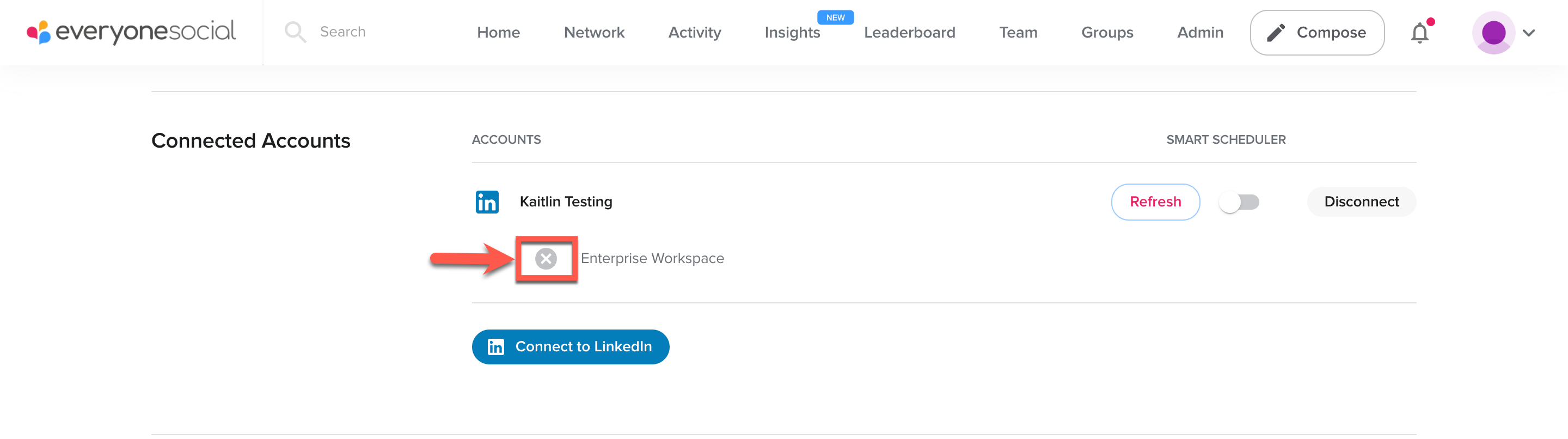 - Click the gray "x" next to the company page under your LinkedIn connection in your EveryoneSocial profile.
