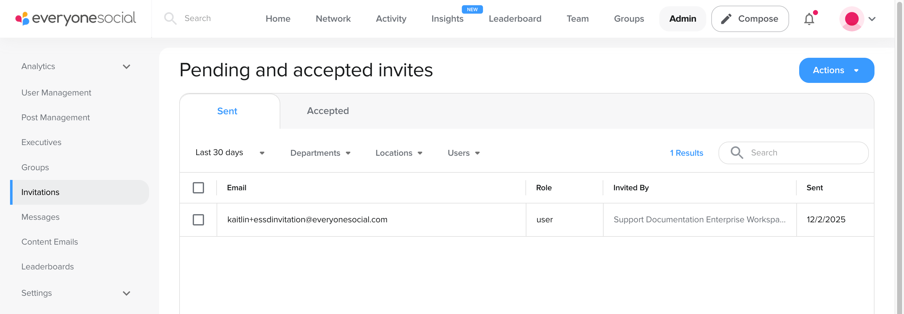 Admins can send and manage invites using Invitations, which sends an invitation email that contains a link to join EveryoneSocial. There is no expiration on invitations. The invitation is sent once, and the link is valid until it is accepted or until the invitation is revoked.