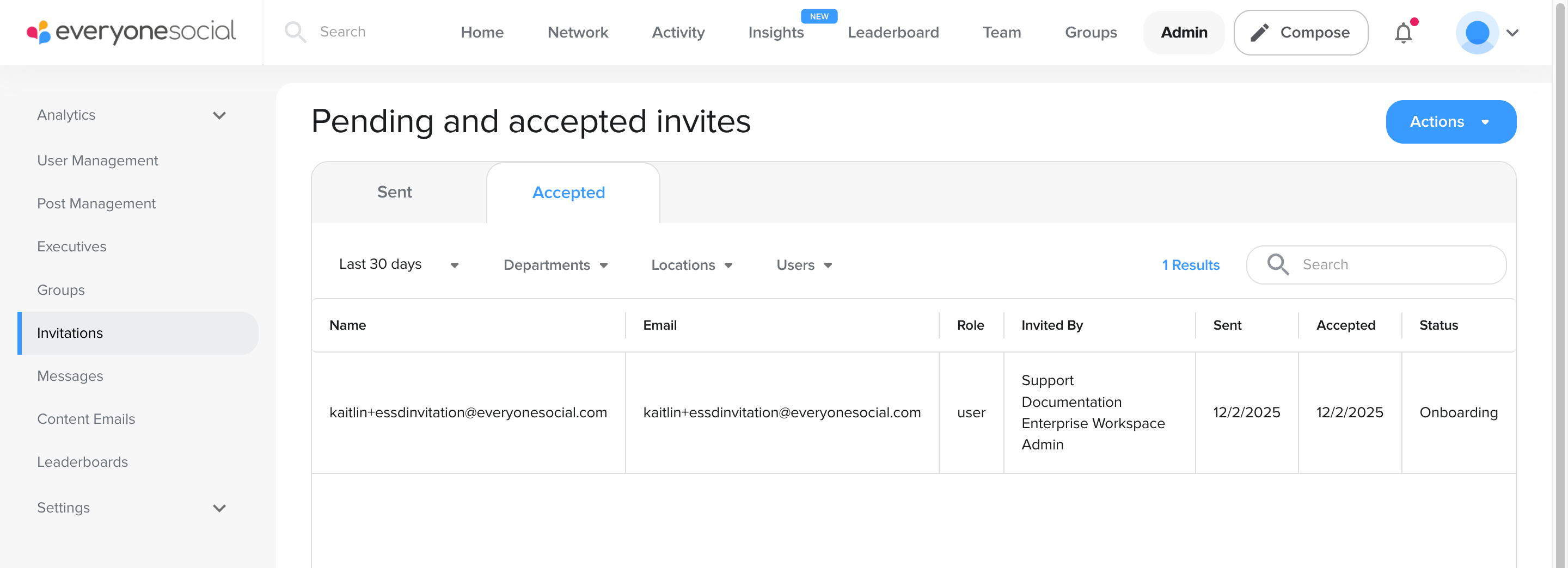 Accepted invites display invitations accepted within the specified time range. See who accepted the invitation, the user's email address, the user's role, who invited the user, when the invitation was sent, when the invitation was accepted, and the user's status.